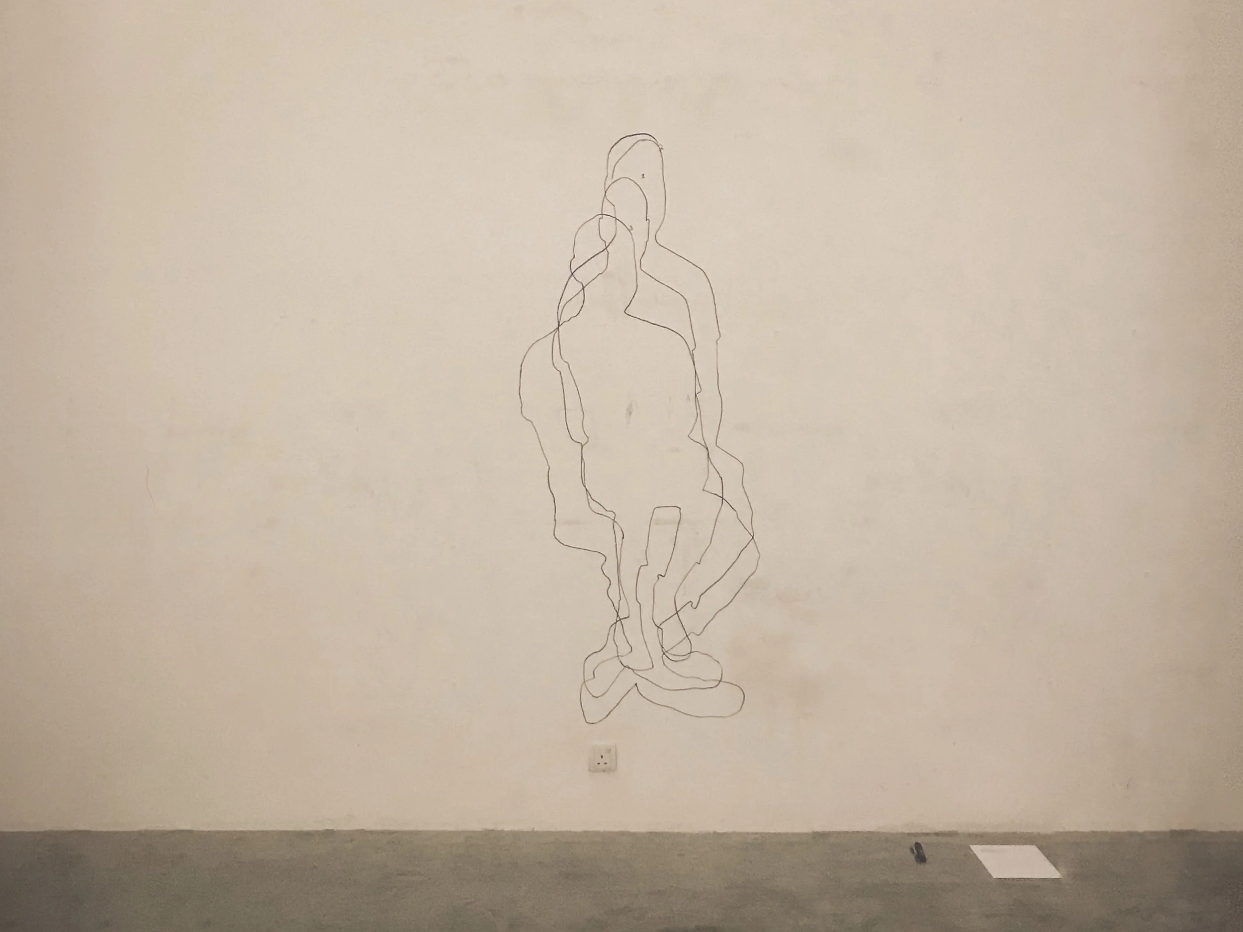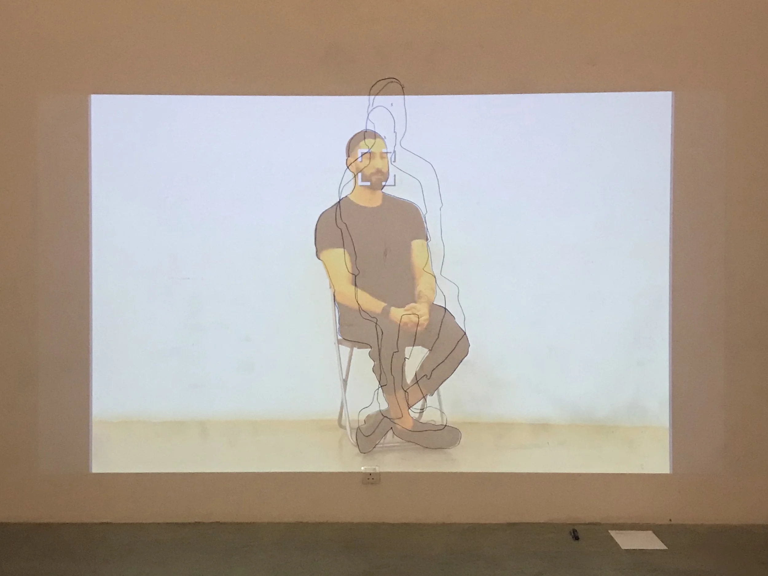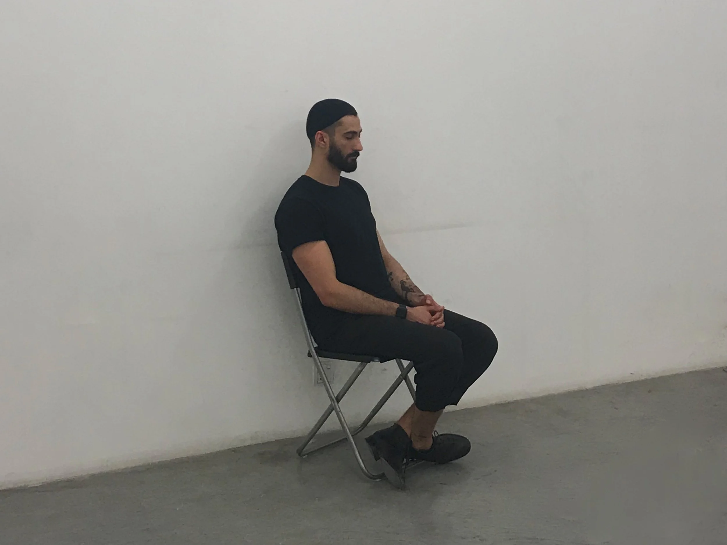 Artist sits behind an outline of his silhouette for the duration of 4 hours, struggling to keep still within the boundaries of his own shape.